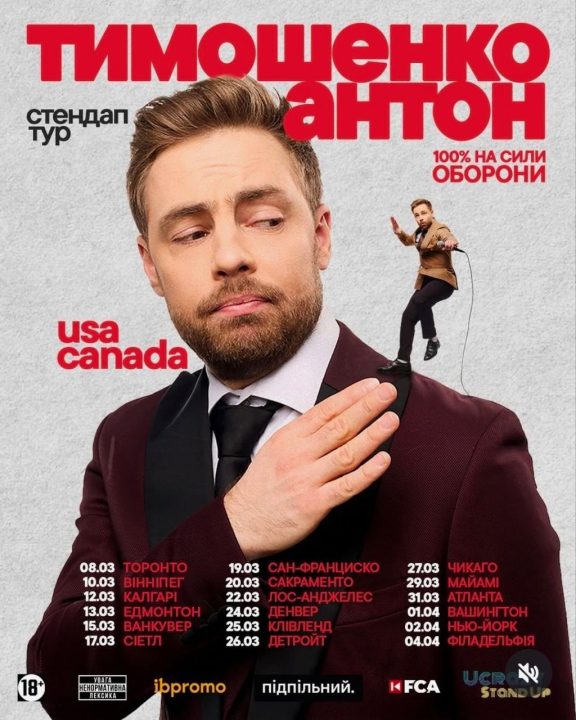 Антон Тимошенко — один із найвідоміших українських стендап-коміків, який поєднує гумор із гострою соціальною та актуальною тематикою. Його благодійні тури за кордоном уже неодноразово допомагали збирати кошти для потреб оборони України.