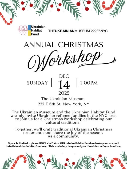 Різдвяний творчий воркшоп у Українському музеї в Нью-Йорку — це тепла благодійна подія для українських родин-біженців. У дружній атмосфері учасники разом створюватимуть традиційні українські різдвяні прикраси, знайомитимуться та відчуватимуть дух свята, зберігаючи й передаючи нашу культуру та традиції.