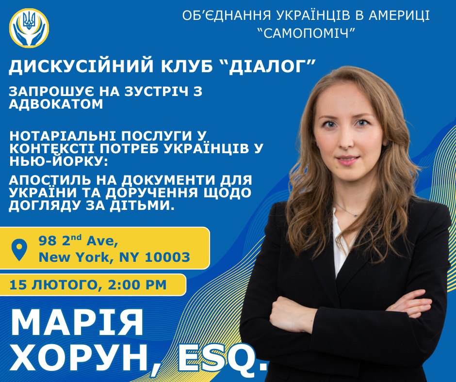 На зустрічі будемо обговорювати нотаріальні послуги у контексті потреб Українців у Нью-Йорку, зокрема апостиль на документи для України та доручення щодо догляду за дітьми.